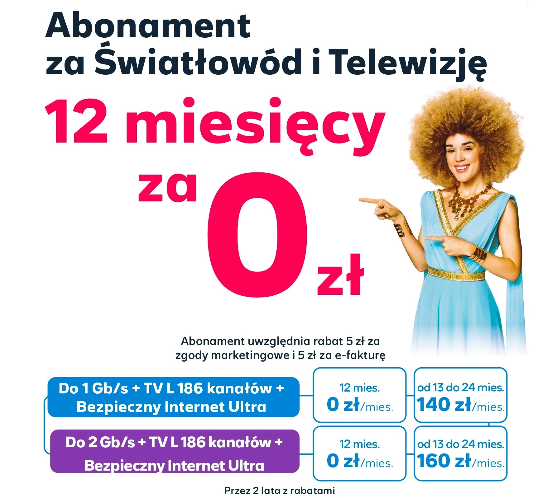 Prezentowana oferta Netii S.A.: „Wybierz szybszy Internet 6 mies. 1/2Gb/s (PON, HFC, ETTH)”,„Wybierz rabat 12 miesięcy (PON, HFC, ETTH)”, „Wybierz super cenę (PON, HFC, ETTH)”, „Wybierz super cenę 300 Mb/s (PON, HFC, ETTH)” obowiązuje przy zawarciu Umowy na czas określony 24 pełnych Okresów Rozliczeniowych przy jednoczesnym korzystaniu z rabatów za e-fakturę (5zł) i zgody marketingowe (5zł). W przypadku rezygnacji lub niespełnienia warunków przyznania rabatów, cena wzrośnie o 10 zł. Wraz z pierwszą fakturą zostanie naliczona opłata aktywacyjna w wysokości 79 zł za Internet i 2 zł za Telewizję. W promocjach „Wybierz szybszy Internet 6 mies. 1/2Gb/s (PON, HFC, ETTH)”, „Wybierz rabat 12 miesięcy (PON, HFC, ETTH)” po 24 miesiącach cena abonamentu wzrasta o 10 zł a w „Wybierz super cenę (PON, HFC, ETTH)”, „Wybierz super cenę 300 Mb/s (PON, HFC, ETTH)” po 24 miesiącach cena abonamentu wzrasta o 20 zł. Szybki Internet Max (300, 600, 1000, 2000) stanowi wyłącznie nazwę marketingową. Usługa Internetowa oparta jest na parametrach jakości wynikających z maksymalnych parametrów technicznych danej technologii, w jakiej świadczona jest Usługa Internetowa lub wynikających z ofertowych ustawień technicznych łącza. Prędkość 2 Gb/s jest dostępna na technologii PON. Parametry świadczenia Usługi Internetowej, w szczególności parametry prędkości oraz wpływu innych Usług na Usługę Internetową, dostępne są na stronie netia.pl. Oferta jest ograniczone terytorialnie do zasięgu stacjonarnej sieci PON, HFC, ETTH Operatora.